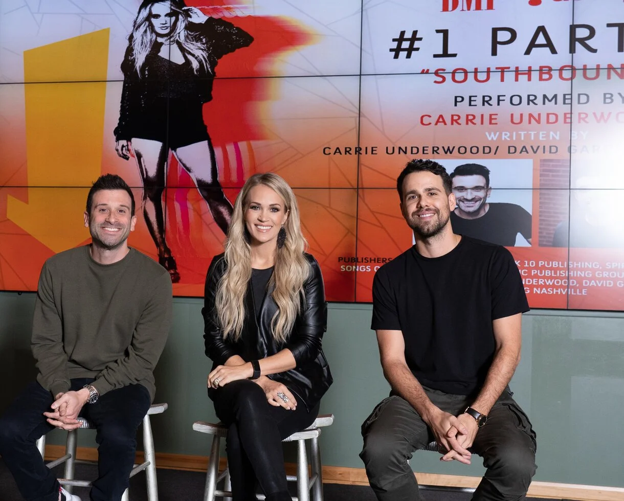 Carrie Underwood celebrates her No. 1 hit, “Southbound,” with her co-writers David Garcia and Josh Miller. (Steve Lowry/BMI)