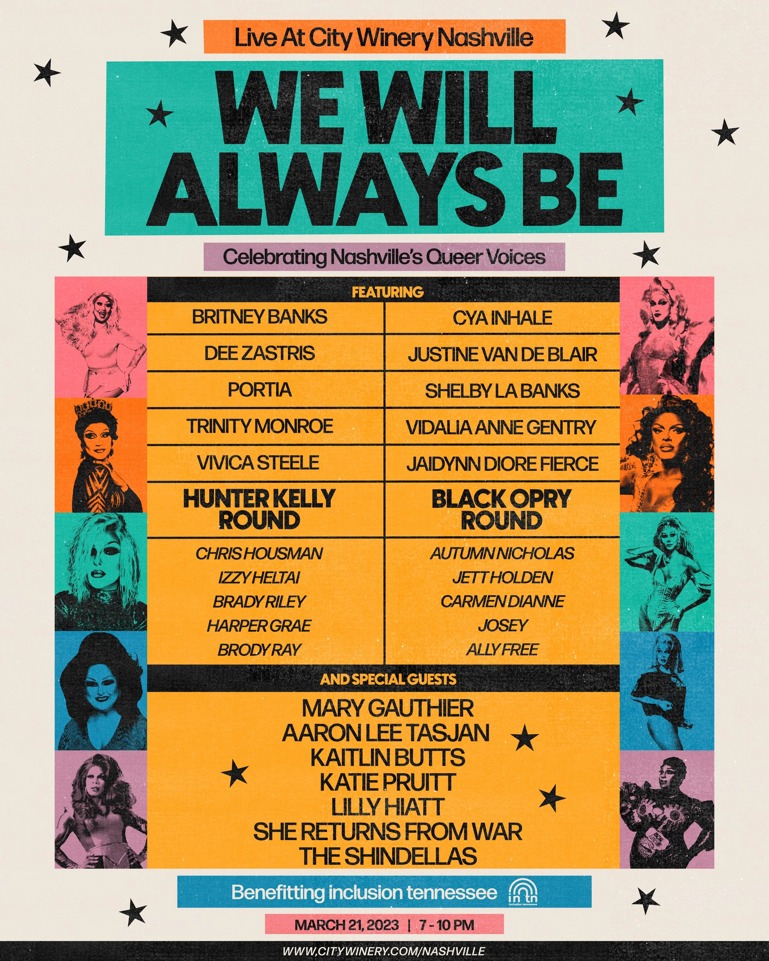 Scheduled for Tuesday, March 21, at 7 p.m. at City Winery Nashville, We Will Always Be: A Benefit for Inclusion Tennessee will include performances by local drag queens Britney Banks, Cya Inhale, Dee Zastris, Justine Van de Blair, Portia, Shelby La Banks, Trinity Monrow, Vidalia Anne Gentry, Jaidynn, and Vivica Steele and feature songwriter rounds curated by Kelly and the Black Opry and additional sets from Aaron Lee Tasjan, Kaitlin Butts, Katie Pruitt, Lilly Hiatt, Mary Gauthier, She Returns From War, and The Shindellas. A complete lineup of performers is below.
